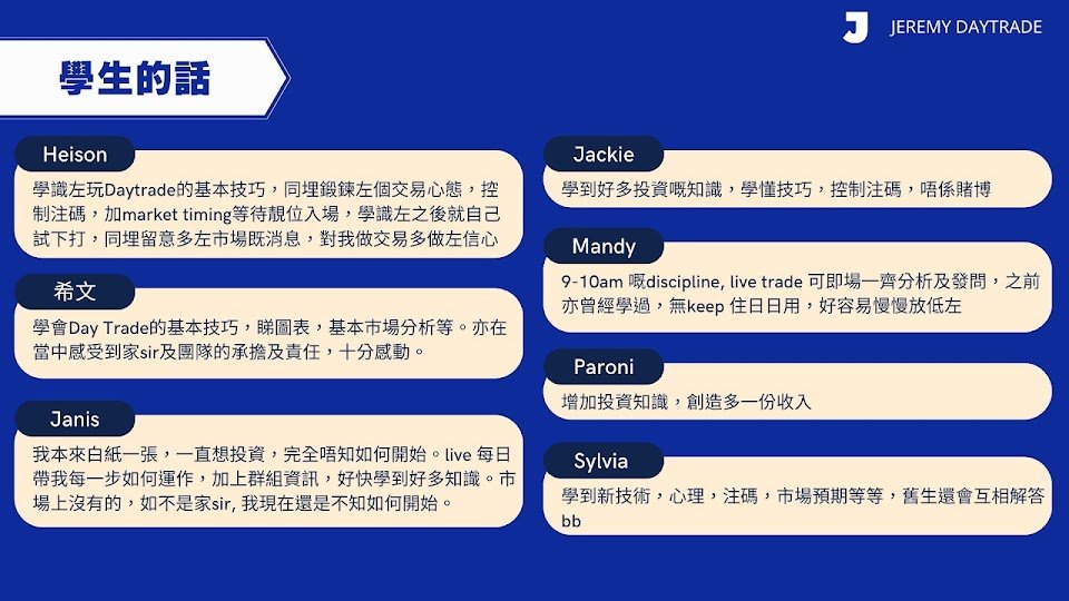 Most instructors teach only theory. Jeremy Lai believes real trading is the only way to genuinely invest. Therefore, he provides hands-on simulated combat to eliminate purely theoretical learning.
